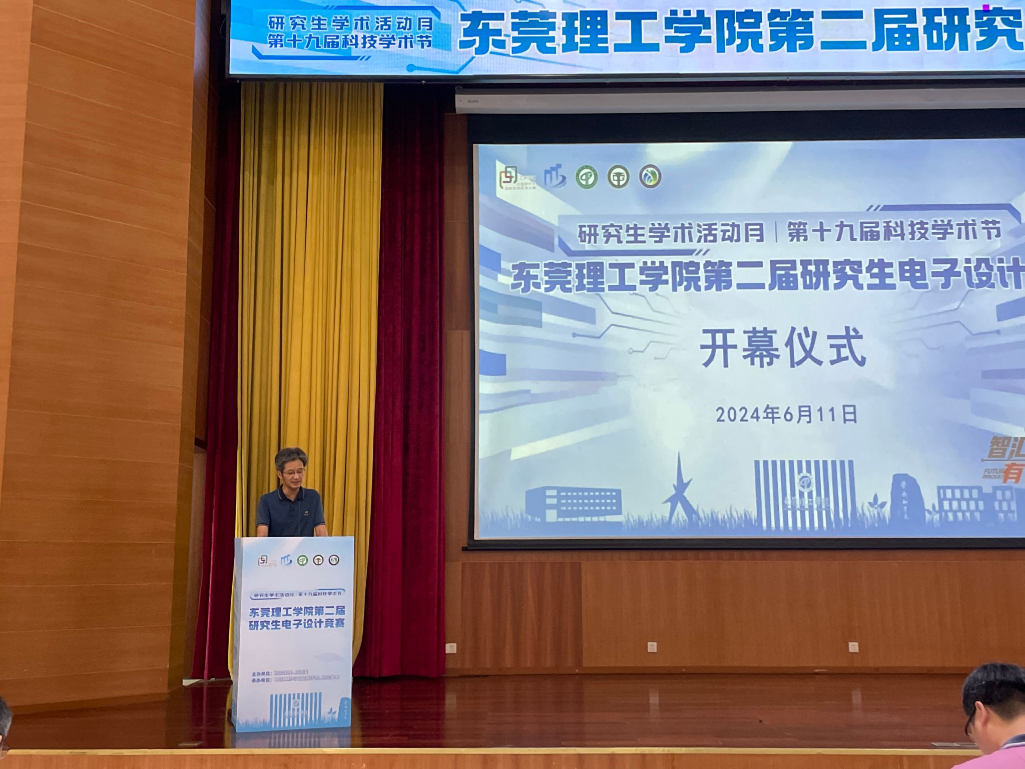 开幕式上,彭晓波致辞。他指出,我校自开展研究生教育以来,坚持面向国家重大需求,在大湾区大力推进电子信息科技领域成果转化和产学研融合。在2023年的“兆易创新杯”第十八届中国研究生电子设计竞赛中,我校参赛队伍表现出色,从闯入决赛的、来自全国134所高校的500余支队伍中脱颖而出,大放异彩,夺得了最高殊荣“研电之星”团队奖和两个技术竞赛全国一等奖。今年继续举办研究生电子设计竞赛,希望通过“以赛促研”、平台展示等方式,深入推进产教融合、服务支撑东莞高质量发展。