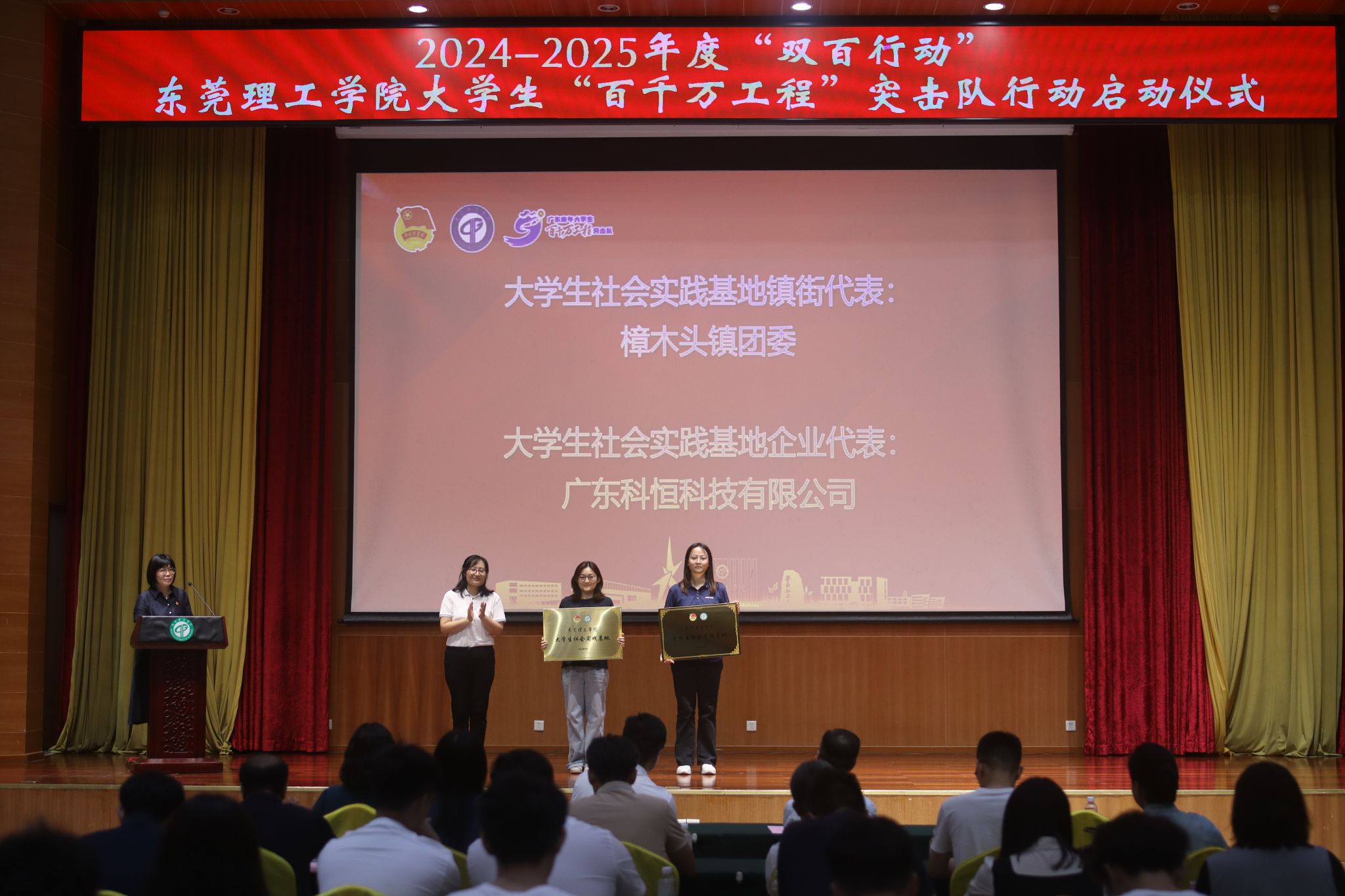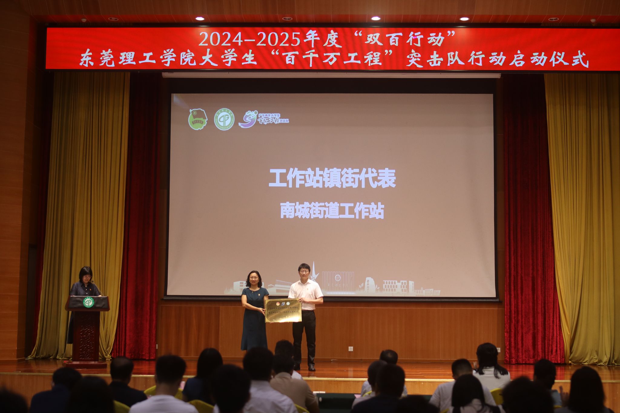 为进一步深化广东青年大学生“百千万工程”突击队行动,助力“百千万工程”建设加力提速,更好地支持和保障突击队团队开展“百千万工程”实践服务活动。我校与南城街道共建突击队工作站,并与部分镇街及企业共建了一批大学生社会实践基地。党政办副主任李利平为工作站镇街代表南城团工委副书记邱昕授予工作站牌匾;校团委书记劳丹为镇街代表樟木头镇团委副书记赖贝静和企业代表广东科恒科技有限公司科研项目经理梁敏仪授予大学生社会实践基地牌匾。