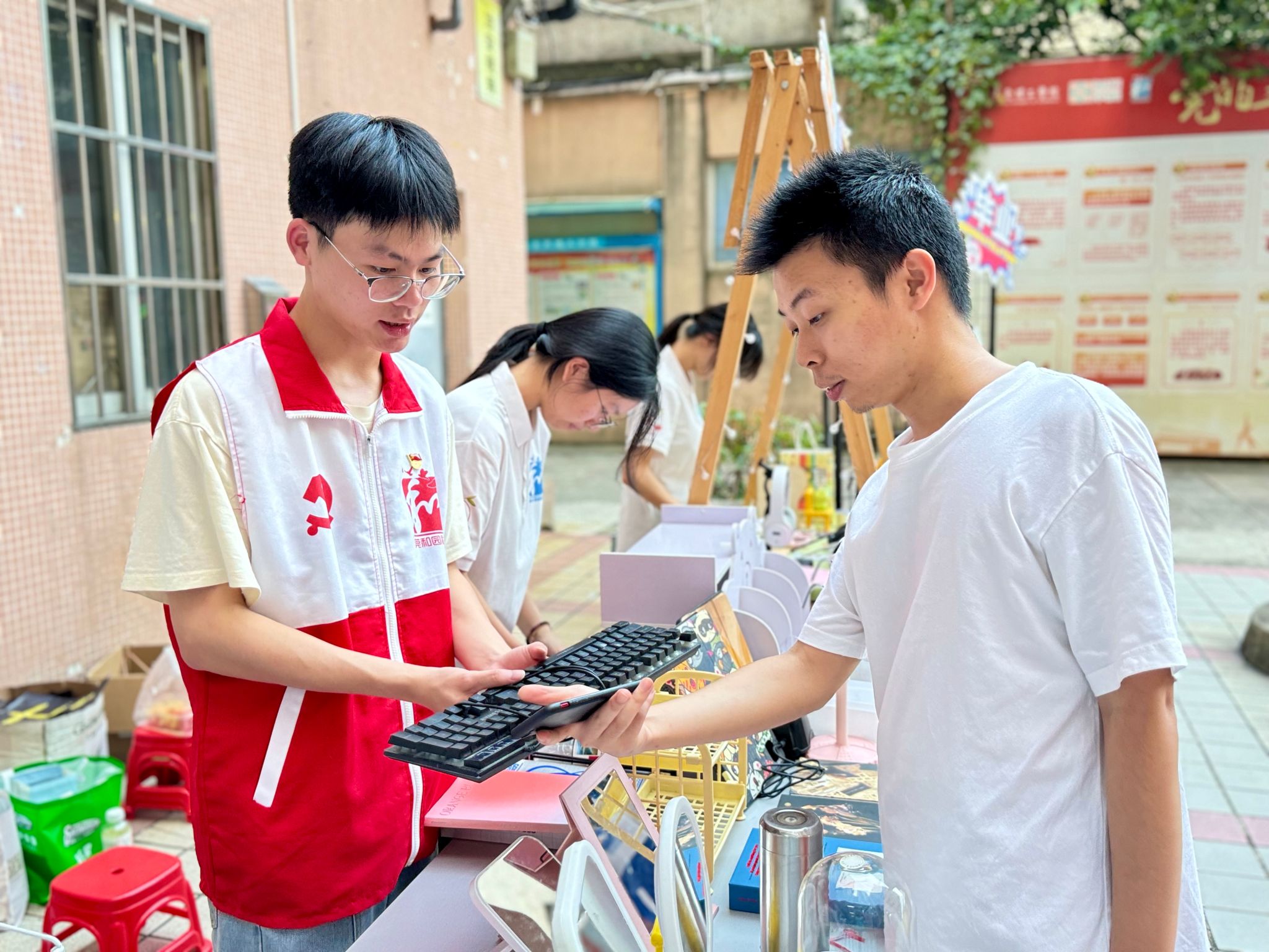 将可持续发展教育与社区育人深度融合,依托一站式社区便捷平台,将绿色理念内化为学生的自觉行动。“旧物奇遇记”流转平台:一站式社区平台,让资源流转与美育实践无缝衔接。两校区设立10个集中回收点,分类回收生活及学习用品、手工艺品、运动器材等物品共计1867件。通过公益捐赠、免费领取,实现资源高效循环;更将回收旧物就地转化,打造“便民服务站”“共享健身角”等社区微空间,并开展“花束重生”插花活动,提升学生“认识美、发现美、创造美”的素养。积极参与的毕业生获得定制环保纪念品(环保袋、胶带、扇子),为行李打包添便利,更镌刻独特绿色毕业记忆。毕业生王同学表示,看到自己的物件被学弟学妹珍视,仿佛青春有了新的延续。“宿舍格式化”绿色承诺:身体力行的行动,是社区育人最生动的环保课堂。倡导毕业生离校前深度清洁宿舍,恢复原貌,分类处置物品,践行绿色离校,截至6月下旬,两校区已结束格式化的宿舍共1369间。这不仅是对公共空间的爱护,更是为新生留下整洁的“绿色礼物”,传递责任与关怀。正如一位正在清洁宿舍的毕业生杨同学所说:“舍友们平常就把宿舍维护得很好,离校时大家把物品整理了一下,有价值的捐掉,没价值的扔掉,所以几乎不用怎么整理就很好了。但我们想着离校前要尽最后一份力,为学弟们创造一个更好的宿舍环境。因为当年我们刚搬进来时,宿舍也是这么干净整洁的。”“图书漂流”知识薪传:漂动的是资源,沉淀的是社区人文温度与学术传承。鼓励毕业生捐赠教材读物,附上温情手写寄语。在社区及公共区域设立共享书柜,让书香与知识在校园延续。一位捐书学子分享:“这些书承载着自己四年的心血,扔掉或卖掉都不忍。能通过活动留给学弟学妹,实现资源不浪费和心意传递,是最好的归宿。”