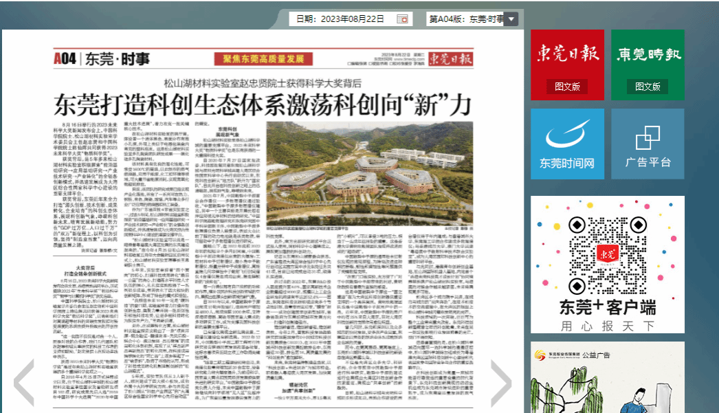 松山湖材料实验室是松山湖科学城的重要支撑平台。2023未来科学大奖“物质科学奖”也是东莞获得的一大重磅科技大奖。
