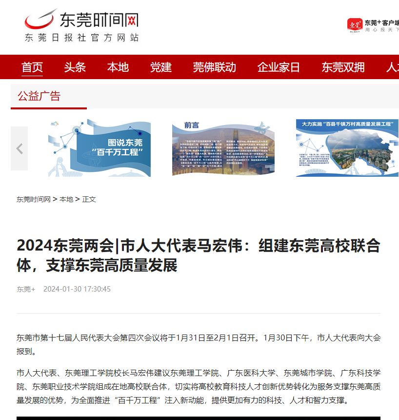 今年东莞两会,马宏伟带来了《加强教育科技人才三位一体协调发力 支撑服务保障东莞高质量发展》的建议,他表示,在推动东莞高质量发展,擦亮“科技创新+先进制造”城市特色,打造“百千万工程”东莞样板、推进中国式现代化东莞实践过程中,要充分发挥东莞在地高校在学科、人才和科研等方面的优势和特色,切实将市域、镇域、村域所需,转化为高校行之所向,把服务支撑东莞高质量发展和推进学校高质量办学紧密结合起来。