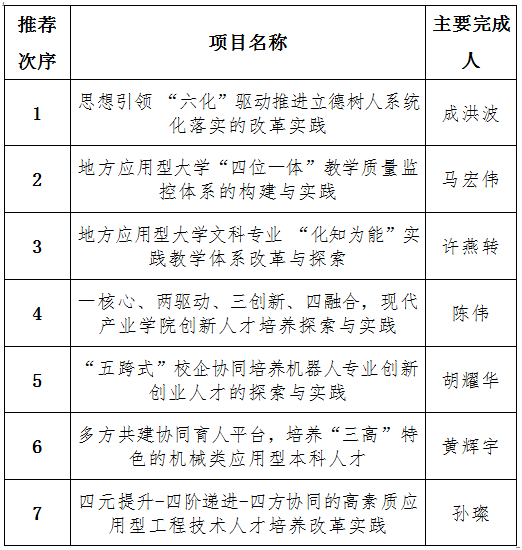 根据《广东省教育厅关于开展2021年广东教育教学成果奖评审工作的通知》(粤教人函〔20218号)的要求,我校组织了广东省教育教学成果奖参评项目的推荐评审工作。经个人申报,教务处审核、专家组答辩评审、教学指导委员会投票表决,校长办公会研究后决定,拟推荐“思想引领六化驱动推进立德树人系统化落实的改革实践”等7个项目参评2021年广东省教育教学成果奖,推荐名单及推荐次序见附表,现予以公示。