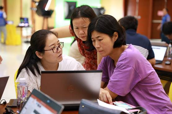 培训现场还安排了微课DIY体验活动,分文理科虚拟抠像摄制体验区和可汗学院模式体验区。根据三个主题培训分享的内容,参训教师对PPT和讲稿进行了修改,并积极参与了拍摄体验。