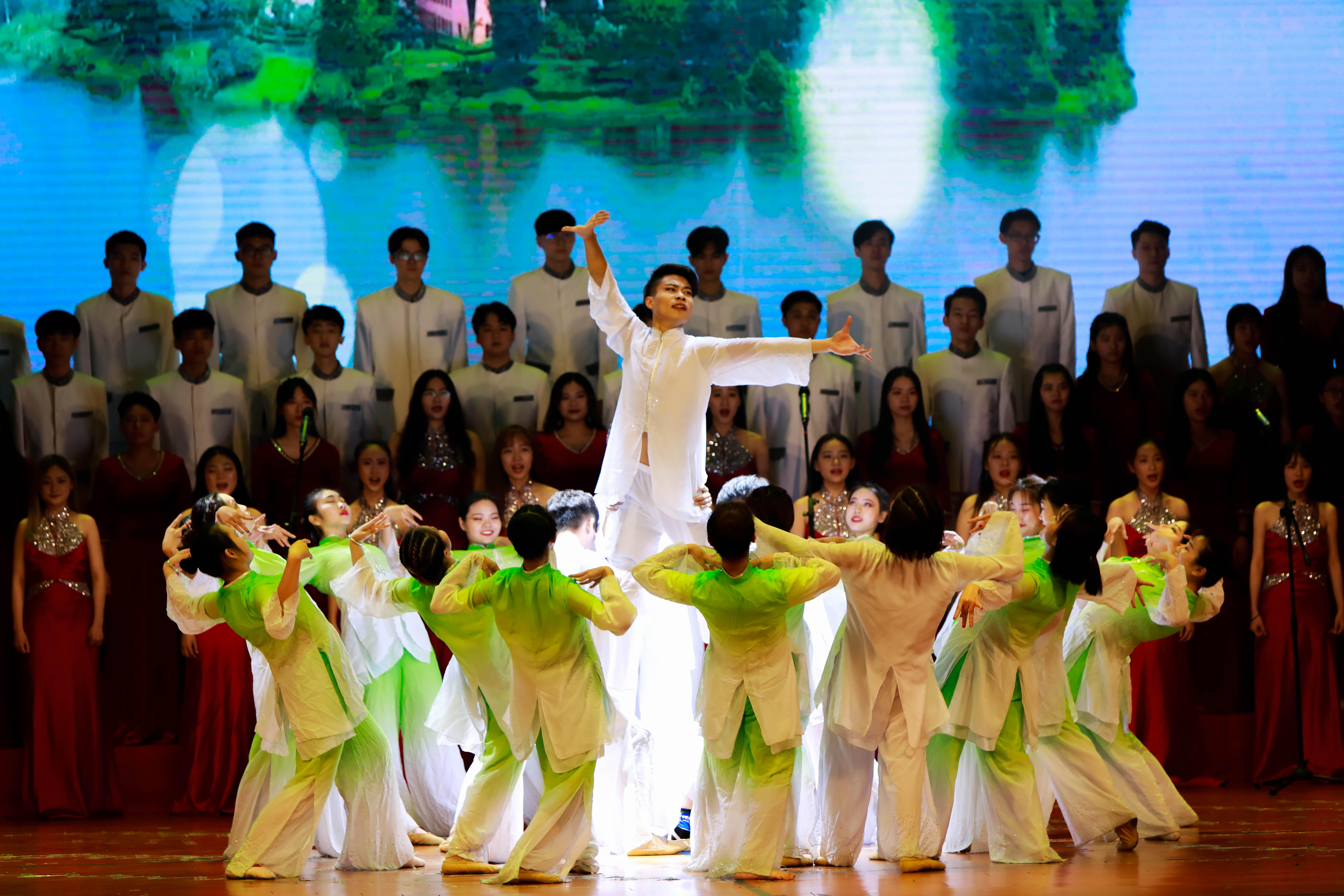 晚会的节目丰富多样。歌曲类节目有合唱《松山湖,我理想的家园》,张扬的红与朴实的绿相结合,再加上动听的歌声,创造了一派生机盎然的景象;经典歌曲联唱《心中的歌》,不但画风多变,而且旋律优美,令人流连忘返;女声独唱《国旗升起》,当国旗升起那一刻,仿佛世界都沸腾了起来;舞蹈表演有经典篇目《传承》和《彩虹桥》,不用千言万语,仅一个动作,一个眼神便可传达出万般情绪;乐器合奏《我的祖国》,高亢的号,低沉的琴,恢弘的男女声,娓娓述说着对于祖国的热爱;弹拨乐合奏《春郊试马》向观众展现出中国传统乐器的魅力;杨万江老师的诗朗诵《我骄傲,我是中国人》,慷慨激昂的诗句,令在场师生感到无比振奋与自豪。整场晚会中,歌声悠扬,鼓声悠远,舞姿曼妙,台上的表演者以其精湛的技术呈现出一场视觉、听觉的盛宴,台下的观众听得陶醉,看得入迷。晚会在热烈的掌声中圆满落幕。