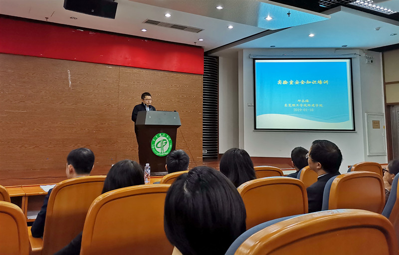 讲座由生态环境与建筑工程学院副院长、邱永福教授主讲。他主要围绕危险性化学品性质与安全管理,化学实验室废弃物的处理,消防安全、用电安全和气瓶安全基础知识,安全事故的防御与应急处理四个部分向与会人员作了报告。