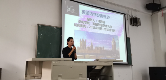 第一场汇报会4月11日举行,文传学院许燕转博士汇报会上,以生动有趣的方式,介绍了她在英国伦敦的个人感受、文化体验。她重点汇报了与导师合作开展的对英国文化创意产业的调查研究,梳理比较了中英在创意教育上的教学模式以及在教学中的运用情况。