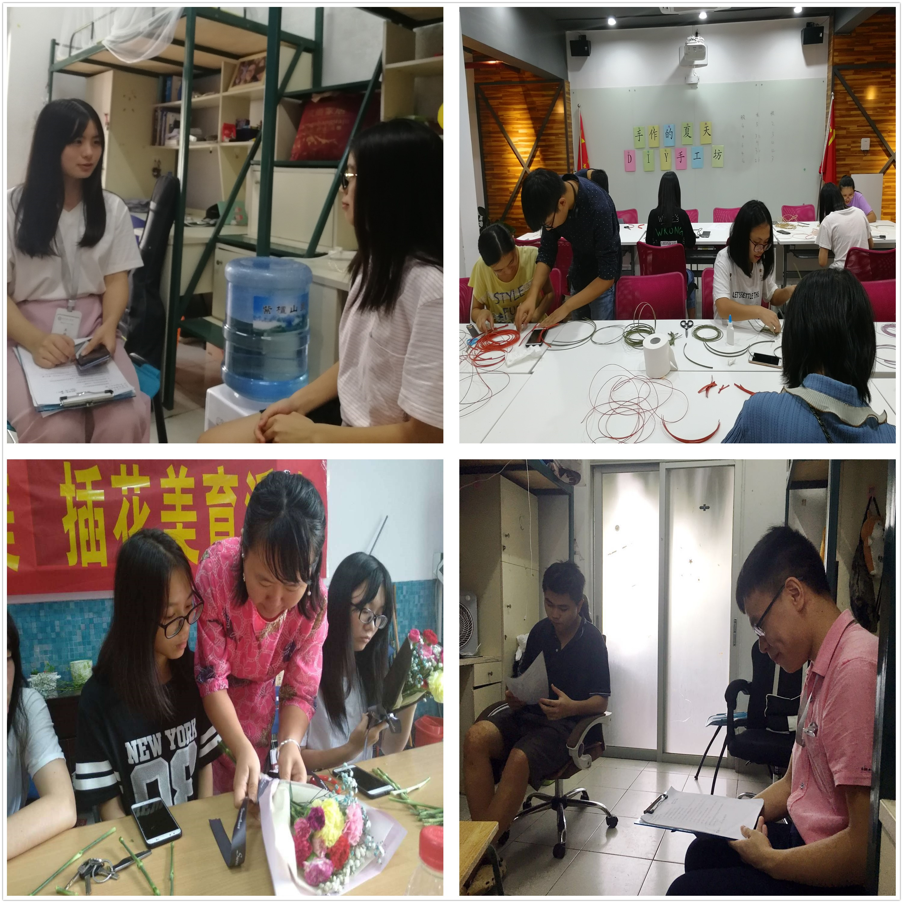 学生社区知行学院开展的一系列活动,丰富了暑期留校学生的生活,找到了一个与同学彼此交流分享的平台。其中,在DIY手工协会会长宋炜的指导下,社工与同学一同完成了纸藤花篮的编织;在莞城校区莞和活动室举行的“花美人美心美,插花美育”活动,参与活动的同学们认真地跟着社工学习插花,基本掌握了花的修枝、拿放、造型、色调搭配和包装技巧,并进行了迷你花束和雨伞花束的制作;社工与学生一同制作、品尝武汉热干面和凉粉等特色小吃,并彼此分享关于记忆中的味道;同学们还体验了动手做烘焙的乐趣。