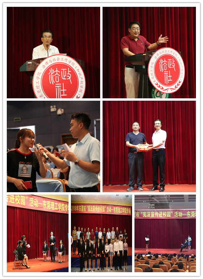 524日下午,东莞市司法局、市普法办携手我校法律与社会工作学院,联合东莞电视台、东城街道等相关政府单位在莞城校区学术报告厅举办了“2018年东莞市宪法宣传进校园”普法活动。东莞市司法局副局长袁洪昌、东莞广播电视台副台长郑远龙、东城街道党委副书记吴沛林、我校法社学院院长强昌文及副院长夏能礼等出席活动。