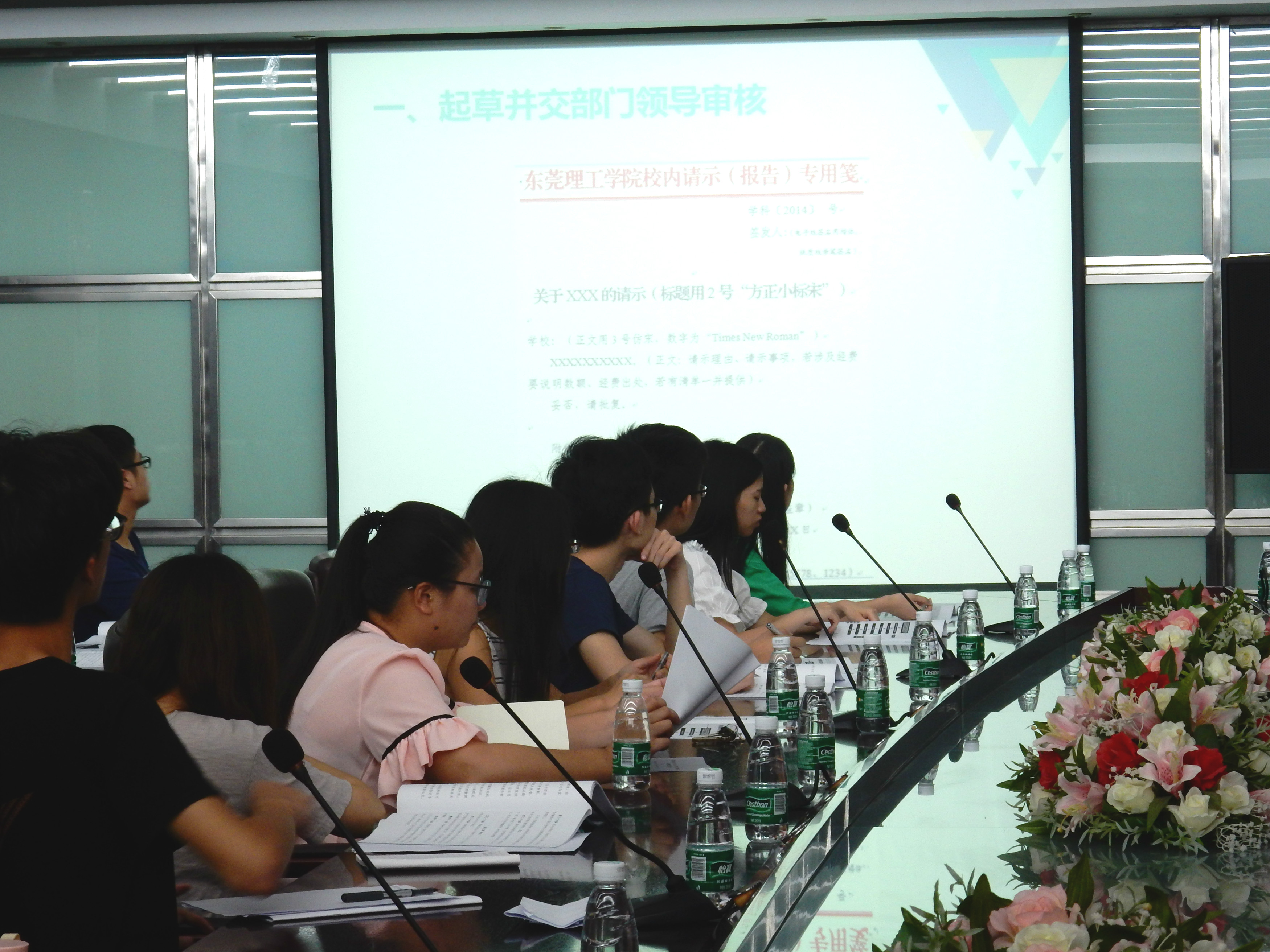 此次培训主要由秘书科老师承担,培训内容分两部分,第一部分由秘书科分别负责请示(报告)流转、校内发文一校、上级来文登记办理的经办人讲解主要工作流程及注意事项;第二部分由秘书科负责人陈老师讲解通知、请示、报告、会议纪要、函、主持词等常用公文的概念、种类、写作特点和要求,同时分享了其在日常工作中起草各类文稿的心得体会。