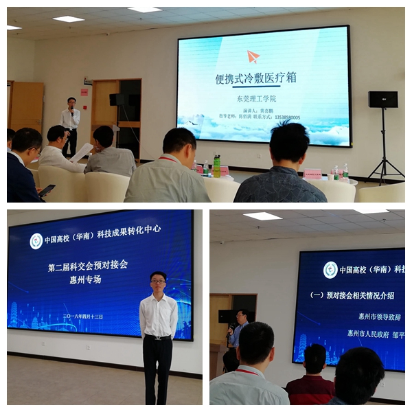 在4月13日的惠州预对接交流会上,化能学院陈捷超博士带领2014级学生黄喜鹏携专利技术进行路演。当地政府惠州市科技部门及部分企业家表达了对路演作品“便携式冷敷医疗箱”技术转化的强烈兴趣,并就技术转化的可操作性进行了深入交流。在整个路演过程中,学生黄喜鹏对答如流,得到了全面综合锻炼。