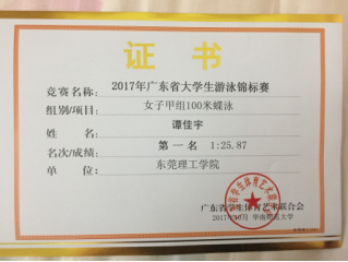 甲组部分,谭佳宇在女子100米、50米蝶泳比赛中,创纪录获得第一名及第三名;男女4×50米混合泳接力中,谭佳宇又和队友陈慧嵘、刘俊杰、叶倬豪等人合作,获得第二名的佳绩;男子50米、100米蛙泳比赛中,刘俊杰分获第二名及第三名的好成绩。