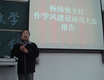 该系主任杨国俊教授针对外语系的现实情况,指出了该系教风、学风中所存在的不足及其整改方向。杨国俊教授还要求同学们珍惜大学四年的时间,学会学习,努力求知求真,将老师所传授的知识融入到自己的思维中,做到知识真正为己所拥有!