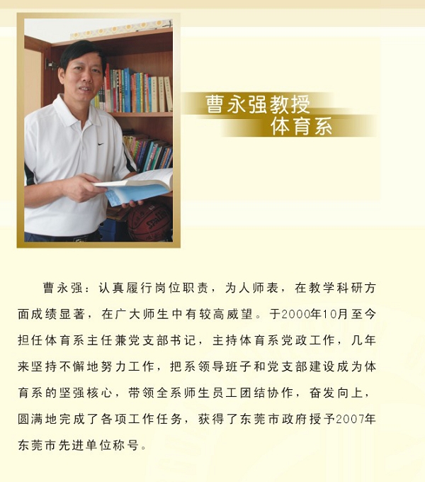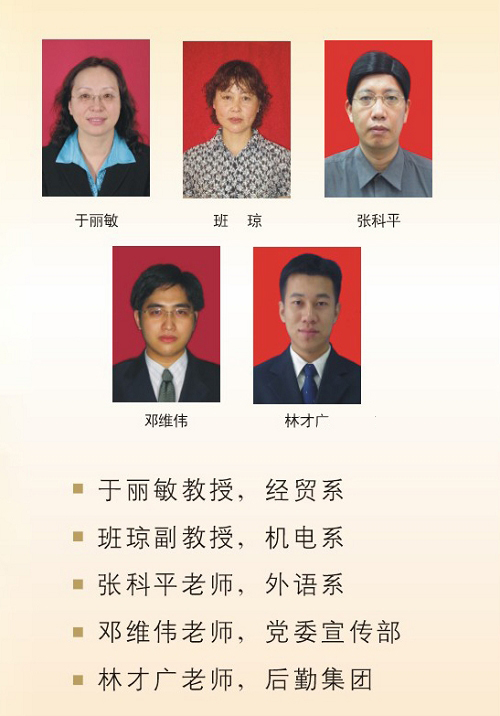 8位老师获得省市优秀教师荣誉称号。其中,钟守炎(机电建筑系)、曹永强(体育系)、杨雷(电子工程系)等3位老师获得“南粤优秀教师”光荣称号,于丽敏(经济贸易系)、班琼(机电建筑系)、张科平(外语系)、邓维伟(党委宣传部)、林才广(后勤集团)等5位老师获得“市优秀教师”光荣称号。