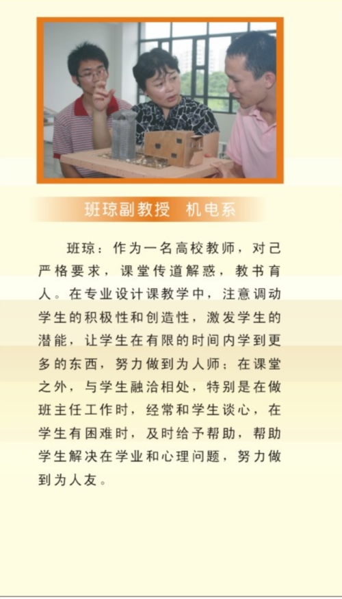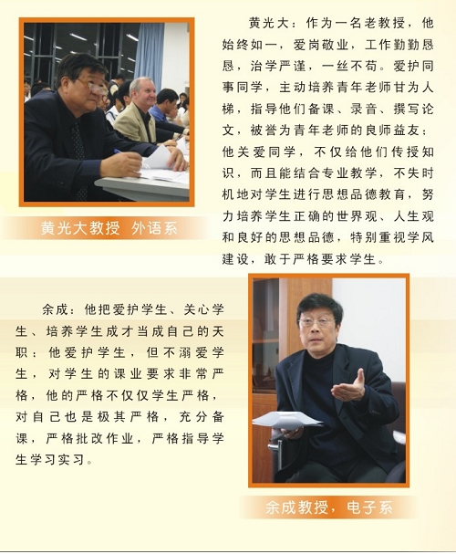 我院还首次评选“师德标兵”。经过一个学期的评选,5名老师荣膺“师德标兵”称号,他们分别是班琼(机电建筑系)、侯爱民(软件学院)、黄光大(外语系)、靖辉(中文系)、余成(电子工程系)。