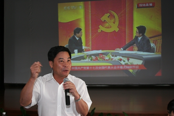 在听完胡锦涛总书记的报告后,学院党委书记周致纳讲了话。他说,十七大的召开令人欢欣鼓舞,胡锦涛总书记的报告更是高屋建瓴、意义深远,体现了新一届党中央务实、爱民、亲民的形象。历史实践也充分证明,中国特色社会主义道路是一条实现国家富强、民族振兴、人民幸福的唯一正确的道路;中国特色社会主义,是中国共产党和中国人民的创造,是历史的选择、人民的选择、时代的选择。他要求全院师生要认真学习贯彻十七大精神,联系实际、突出成效,把广大师生员工的思想统一到十七大精神上来,推动学院发展,构建和谐校园,共同开创学院工作新局面。