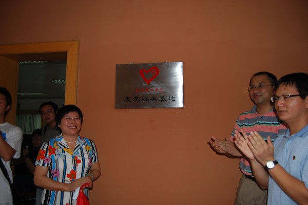 仪式最后,由团市委何学文副书记、校党委黄碧莲副书记、广东宏远篮球俱乐部有限公司胡志强副总经理共同为志愿服务基地揭牌。