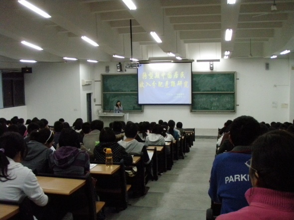 为了帮助大学生加深对中国居民收入分配差距状况的了解,2008年12月9日晚,经贸系在教学楼举行了题为“转型期中国居民收入分配差距研究”的专题讲座。经贸系主任于丽敏教授(经济学博士)担任主讲人。经贸系和工商管理学院的同学参加了讲座。