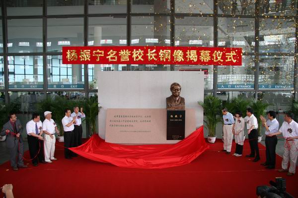 昨日下午4时30分,在300多名师生代表的欢迎下,杨振宁伉俪,老领导郑锦滔,东莞市副市长吴道闻,我校党委书记周致纳、校长杨晓西,虎门镇镇委副书记、镇长任洪杰,中国著名雕塑家、广州美术学院终身教授潘鹤,中国科学院高能物理研究所研究员、博士生导师马中骐,韦杰博士,在图书馆门前共同为杨振宁博士铜像揭幕。