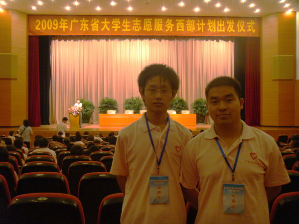 7月20日下午,2009年广东省大学生志愿服务西部计划出发仪式在广州珠江宾馆会议中心礼堂举行。广东省副省长雷于蓝出席大会并讲话,参加出席仪式的还有团省委、省教育厅、省财厅和省人事厅等项目主办单位负责人及230名即将奔赴西部的大学生志愿者。其中包括我校机械工程学院的邓清平和外语系的王尚猛两位毕业生志愿者。