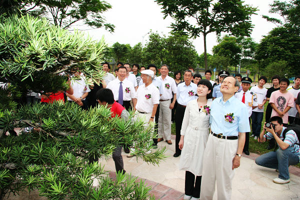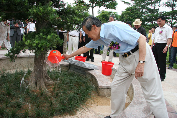 昨日下午5时许,杨振宁博士伉俪在市老领导郑锦滔,我校周致纳书记和杨晓西校长等的陪同下,来到院士林浇灌去年亲植的罗汉松。