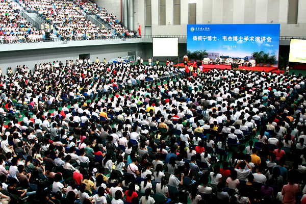 5月18日上午9时25分,杨振宁博士伉俪,韦杰博士一行出现在体育馆门口,全场起立,热烈的掌声持续了一分多钟。在他们演讲和为学生答疑的过程中,也多次出现了掌声。