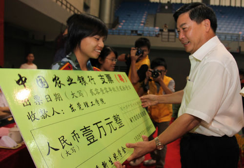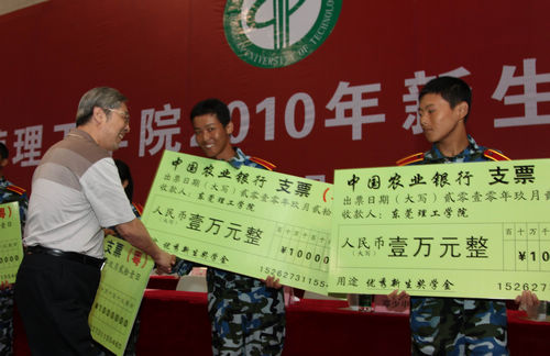 在2010级开学典礼上,校党委书记周致纳对获得乙等奖学金的8名同学进行了颁奖,他们各获得人民币1万元,其录取分数线均超过生源所在地一本省线。 这8名同学分别是电子工程学院的史宏鹏、杨耀,机械工程学院的易斯洛、黄嘉伟,政法学院的旷玲,经济贸易系的符琼星,建筑工程系的陆瑾华、姜兰。