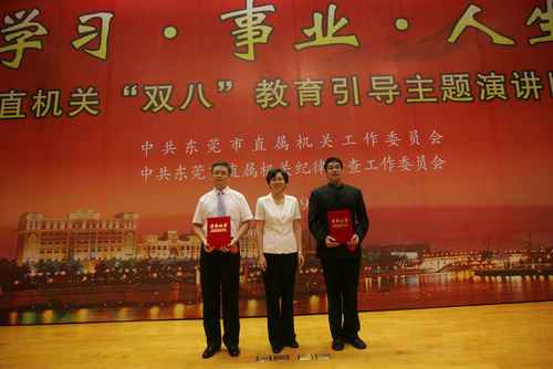 9月25日上午,东莞市直机关“学习?事业?人生”主题演讲比赛决赛在东莞市会议大厦举行,邓磊老师代表我校参赛,并以最高分获得一等奖。东莞市委常委、市委组织部部长庞国梅为获得一等奖的选手颁奖。 本次演讲比赛由中共东莞市直属机关工作委员会和中共东莞市直属机关纪律检查工作委员会主办,共有来自东莞市各机关单位的20名选手进入决赛,其中一等奖共2名,另一名获得一等奖的选手来自东莞市委办公室。