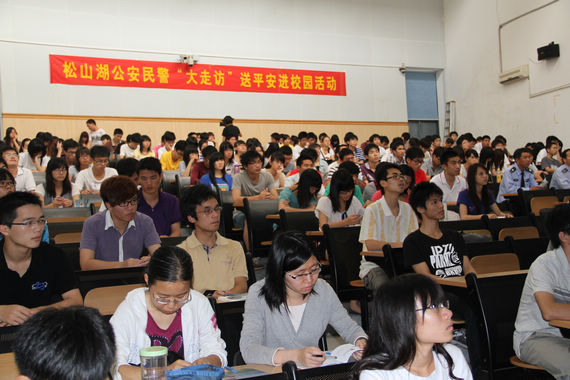 讲座上,朱振华警长通过对法律知识进行讲解,并针对在平时容易遇到的一些安全问题进行了剖析,教育大家在日常学习、工作、生活中如何提高防范意识,避免偷、抢、骗等事件的发生。随后,公安分局各部门代表前往一期饭堂派发安全宣传手册资料、摆放宣传图片等,并在现场设立咨询点,解答各种法律及安全问题,尤其是对同学们普遍反映的如何防范网络诈骗问题,公安民警们详尽指导如何应对,受到同学们的一致好评。