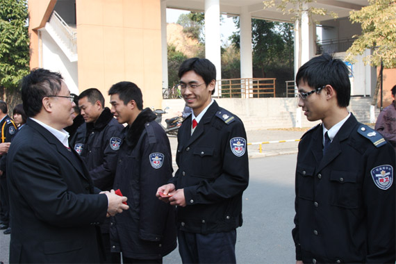 新年伊始,阳光明媚,春意盎然。2月3日(农历正月初一)早上,学校党委书记周致纳,校长杨晓西,党委委员、学校办公室主任李忠红等一行深入基层一线,亲切慰问了在学校坚守岗位的校卫队员、学生联防队员,后勤集团的员工和春节留住学校的学生,向他们致以节日的问候,并送上新春的祝福,祝愿大家在新的一年里百尺竿头,更进一步!