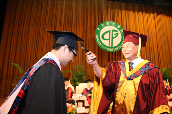 毕业典礼上,校党委书记周致纳向毕业生代表颁发了毕业证书,并与杨晓西一起为获得学士学位的毕业生代表一一扶正流苏。
