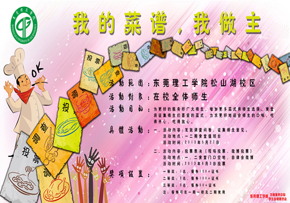 为增加更多菜式供师生选择,让师生吃得开心、吃得放心,后勤集团饮食服务中心本着“用心做好菜,真心奉莞工”的想法与原则,将于5月27日至6月3日联合学生组织自律会开展“我的菜谱,我做主“活动。其中,5月27日,将在第一、二期食堂发放调查问卷,征集师生对食堂菜谱的意见;6月3日,饮食服务中心将根据师生意见筛选出新菜式,通过图文展示形式,在第一、二期食堂及下沉广场开展投票活动。饮食服务中心根据投票情况最终确定新增菜式。