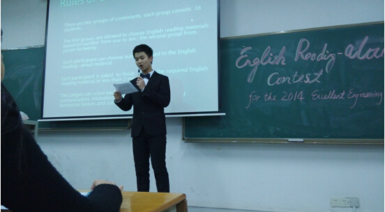 为激发2014级卓越工程师班新生学习英语的积极性,打下良好的英语语音基本功,在教务处主办,外语系协办下,卓越班任课英语副教授王永老师在1229日组织了2014级卓越工程师计划班英语朗读比赛。