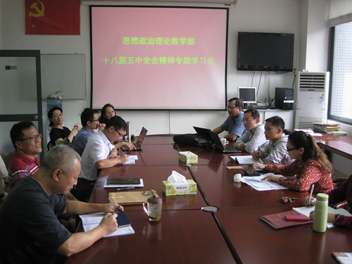 11月12日下午,思政部全体教职工开会,专题学习中国共产党十八届五中全会精神。肖凤良博士做了专题辅导报告。他从“十二五”成就、十三五时期我国发展环境的基本特征、发展的指导思想、发展理念、发展目标、组织建设的新要求等方面对全会精神进行了全面解读,重点解读创新、协调、绿色、开放、共享的发展理念。通过解读,大家对五中全会的精神有了比较清晰的认识。