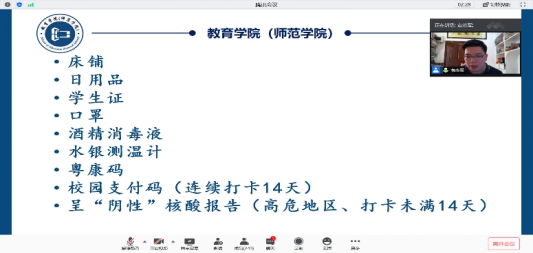 为保证每一个学生都清楚返校规定,8月31日,教育学院(师范学院)专门分年级召开全体学生返校工作线上会议。要求每位学生都必须参加。各年级辅导员在线向同学们详细说明返校注意事项,学院党委副书记黄艺琦就返校后进行相对封闭式管理的必要性和重点问题进行了强调:要求同学们及时上报健康情况,坚决做到每天按时进行信息登记和体温监测,如发现身体不适,应第一时间上报;要服从社区管理,在宿舍内不串门、不聚集,在其它场所严格落实相关指示规定;切实加强安全管理,注意人身安全,预防诈骗活动,及时通报平安。返校后还应积极响应爱国卫生运动,共同创建清洁美好校园。